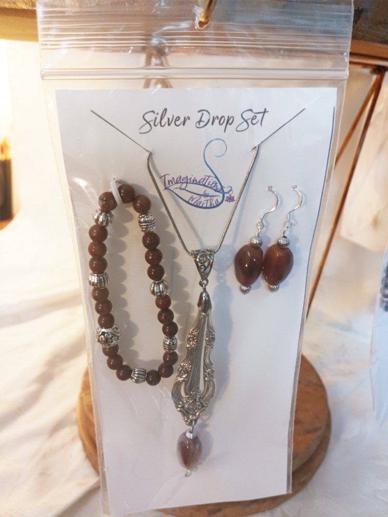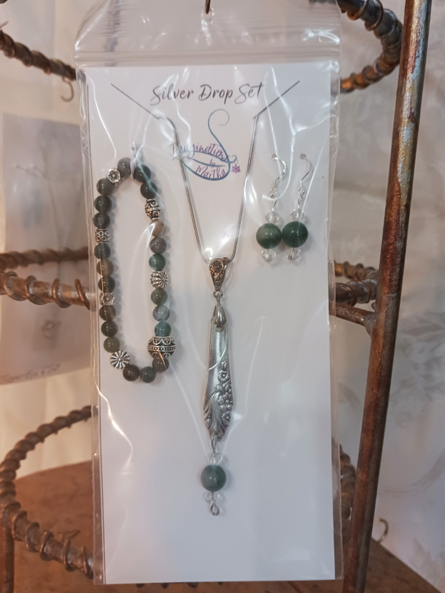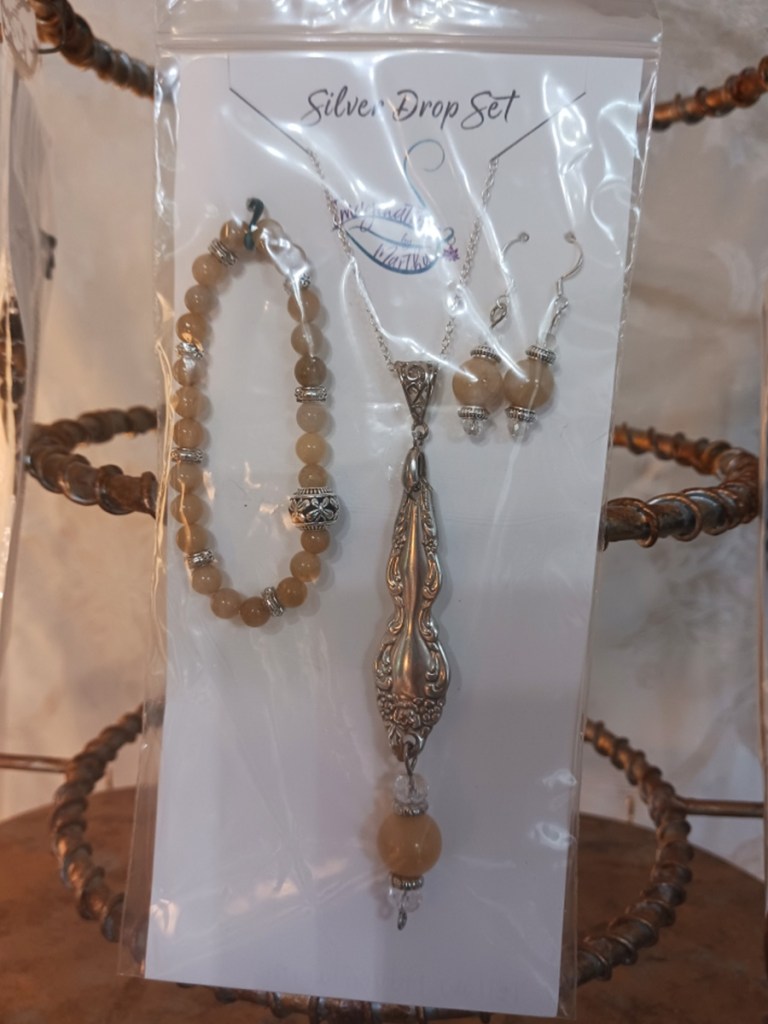 Gemstone and crystal necklace made from vintage silverware includes necklace, bracelet, and earrings